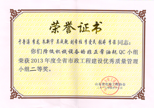 “降低機(jī)械設(shè)備的非正常油耗”QC小組榮獲2013年度全省市政工程建設(shè)優(yōu)秀質(zhì)量管理小組二等獎