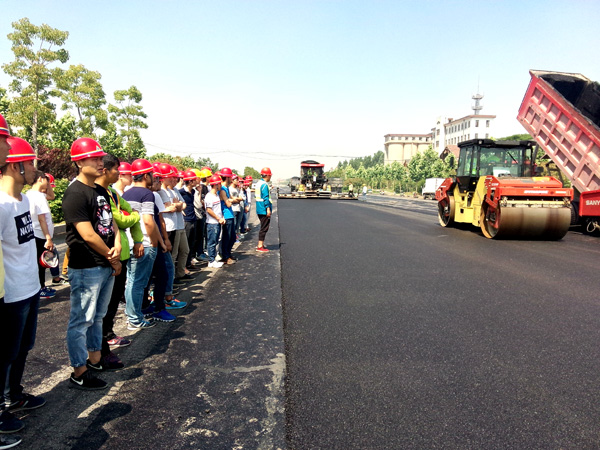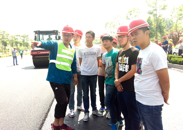 我公司作為棗莊學(xué)院教學(xué)實踐基地,承擔(dān)了棗莊學(xué)院相關(guān)專業(yè)教學(xué)實踐活動相關(guān)職能。為在校生提供實地教學(xué)觀摩和講解,是我公司的一項重要社會職能。本次赴我公司學(xué)習(xí)觀摩的學(xué)生,均為棗莊學(xué)院城市與建筑學(xué)院2013級土木工程專業(yè)在校生。師生一行先后參觀了遠建路橋分公司路面材料生產(chǎn)現(xiàn)場和路橋一分公司匯泉路項目瀝青攤鋪現(xiàn)場。